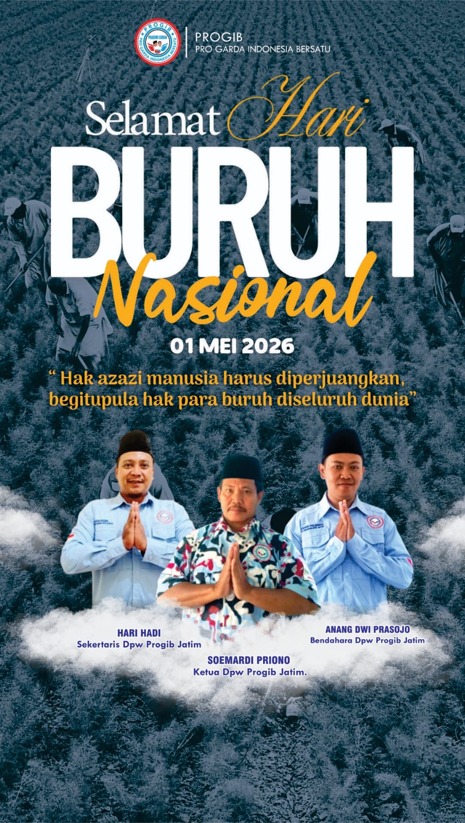 Surabaya, Jawa Timur – Jumat (1/5/2026) – Dewan Pimpinan Wilayah Pro Garda Indonesia Bersatu (PROGIB) Jawa Timur menyampaikan ucapan selamat dalam rangka peringatan Hari Buruh Nasional yang jatuh pada 1 Mei 2026.